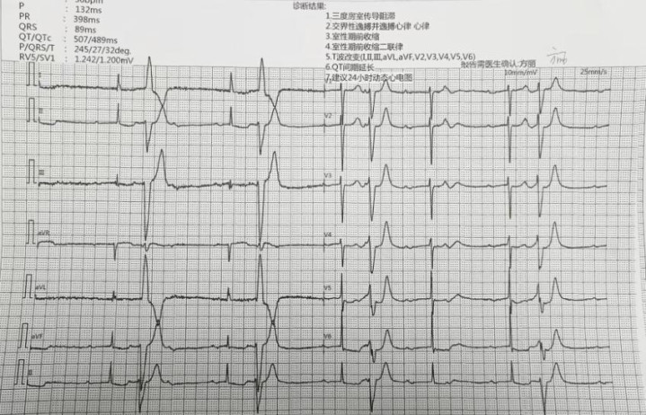 术前心电图领导重要风险,确诊为三度房室传导吃力、接壤性逸搏并逸搏心律及ST-T蜕变。三度房室传导吃力可能激勉心率过缓、头晕甚赤腹黑骤停,而调养无法拖延,旧例手术风险极高,保险术中安全成为首要艰巨。