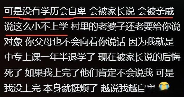 莫得学历会自卑,会被家长说、亲戚说,这样小不上学,村里的细君子还老要说对象,父母也不会向着你讲话。我是中专上课一年半退学了,被家长说的后悔死了,没上完确乎挺烦,越说越自卑。