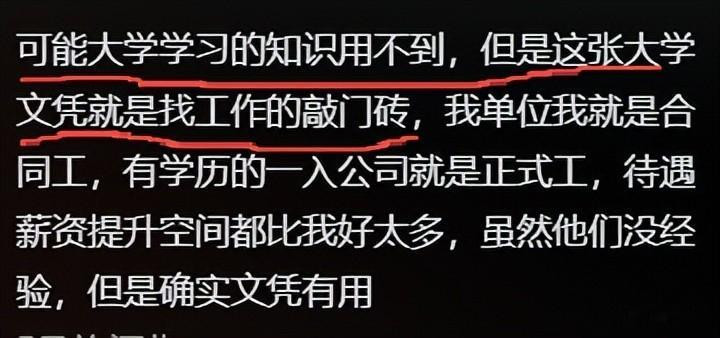 可能大学学的学问用不到,但大学证书等于找职责的垫脚石,我单元我等于契约工,有学历的一入公司等于负责工,待遇薪资升迁空间王人比我好太多,固然他们没教会,然则确乎证书有效。