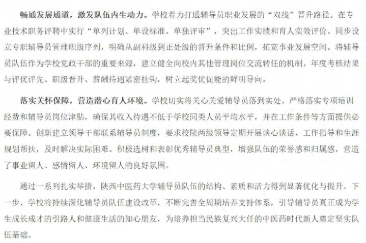 据陕西中医药大学网站音书,该校严格落实专项培训经费和领导员岗亭津贴,确保其收入待遇不低于学校同类东说念主员平均水平,并在责任条目等方面提供必要保险;将领导员队列看成学校党政干部的热切着手,建立健全向校内其他管制岗亭考虑转任的机制。