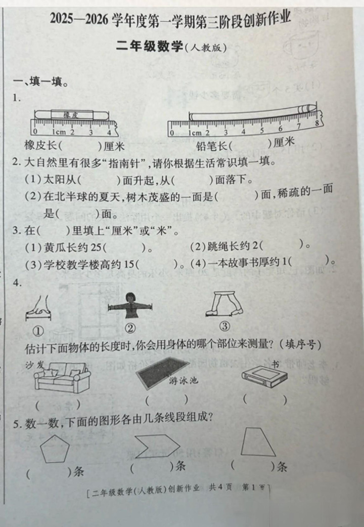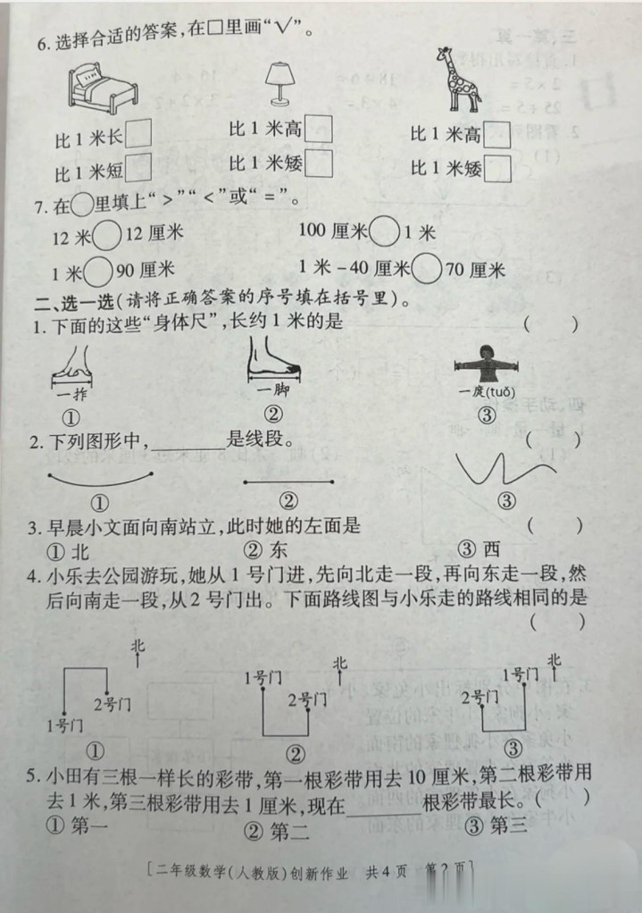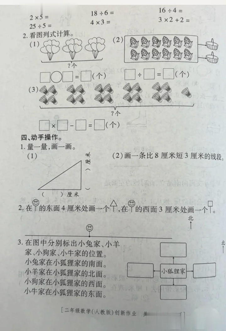四、画好线段后,要注查验线段的两个端点是否彰着,且需要标示出线段的长度。而在作念第3题时,提倡先标示出东南西北四方,再左证题意给各个小动物找家。