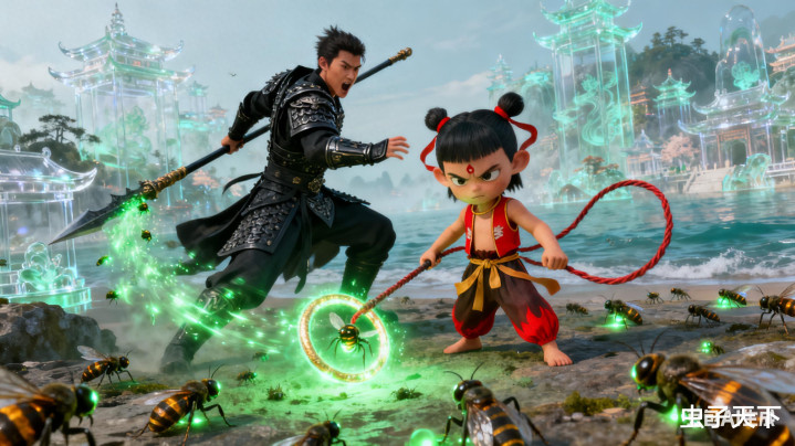 哪吒追得近了,混天绫“呼”地缠上去,黑甲东说念主却遽然回身,把布袋子一撒,宽敞只小虫子“嗡嗡”地飞出来。