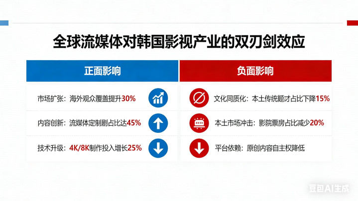 2. 全球流媒体的“双刃剑”效应:以Netflix为代表的全球平台为韩剧、韩影带来了巨额投资和全球曝光,但也带来了挑战。平台在抬高了顶级演员片酬和制作成本的同时,其采购数量却在收缩,这挤压了中小制作公司的生存空间。有观点认为,过高的制作成本正导致韩剧产量下降。