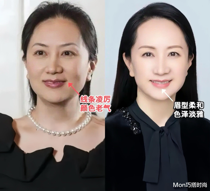 除了底妆要清透天然,彩妆部分也要选合适的色调,许多老到女性可爱齐以为做事妆容得画上凌厉的眉形、深色系的口红,天然很有气场,却也显得很严肃,不妨参考孟晚舟,选更轻柔的眉形,搭配裸色的口红,更温煦有亲和力。