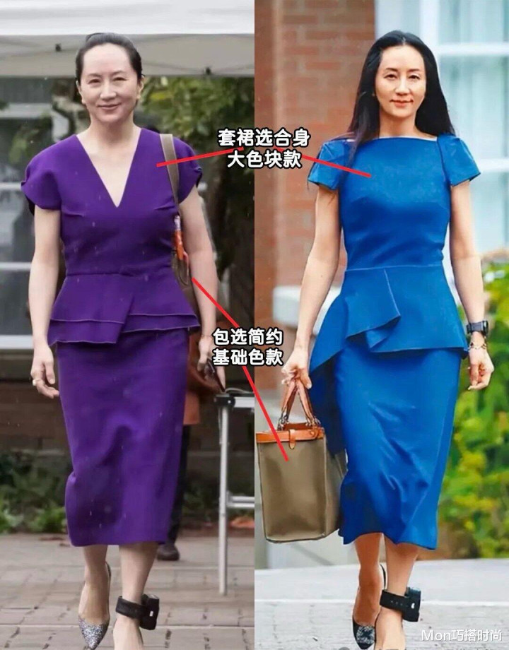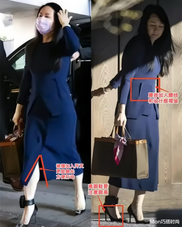 孟晚舟聪惠的小数即是会用做事装混搭,比如穿玄色西装的技巧,内搭一条蓝色的连衣裙混搭,不错增多女东谈主味,中庸外衣的严肃感。