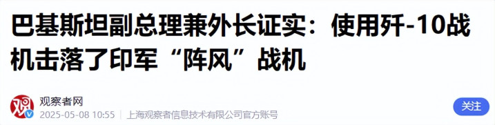 3.《巴基斯坦副总理兼外长说明:使用歼-10战机击落了印军“阵风”战机》2025-05-08 10:55 | 起首:不雅察者网